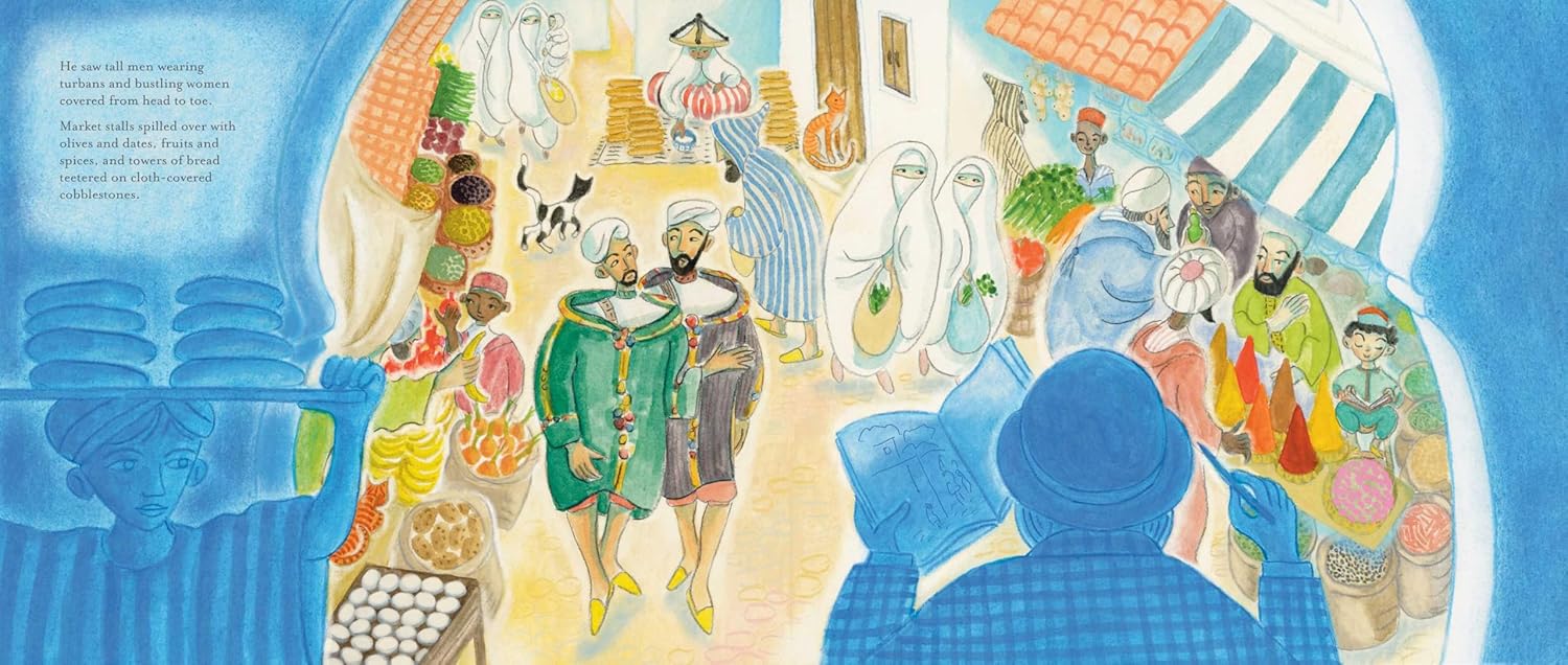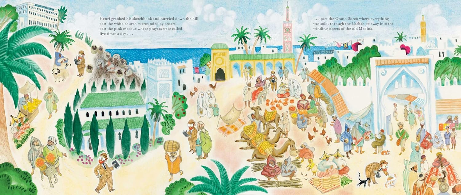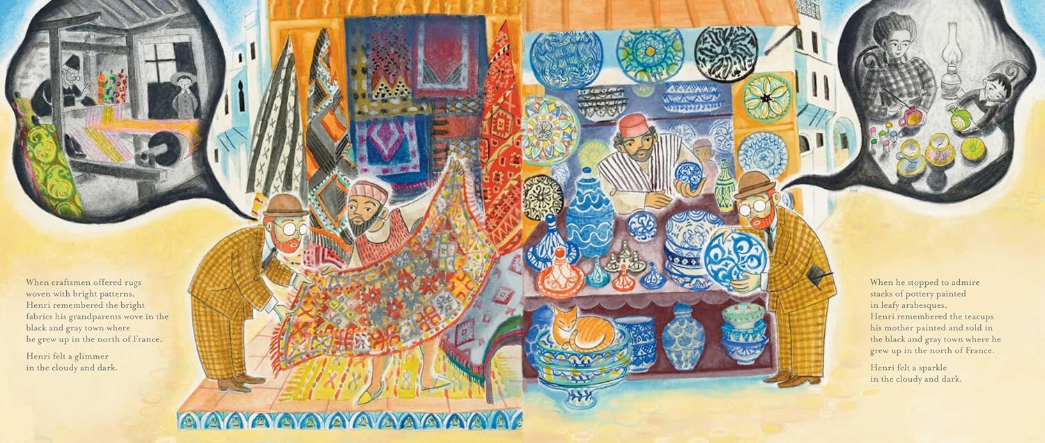 Then one night while Henri slept, the rain stopped. In the morning he woke to ” . . . an abundance of light. A luminous light. A dazzling light.” Henri took his sketchbook and hurried into town, where color shimmered from the pink mosque to the vibrant Grand Socco market to the Casbah gateway to old Medina. Everywhere he looked he saw the vividness of life. Brightly patterned rugs and painted pottery reminded him of the art his grandparents and mother created in their drab town. “Henri felt a glimmer in the cloudy and dark.”