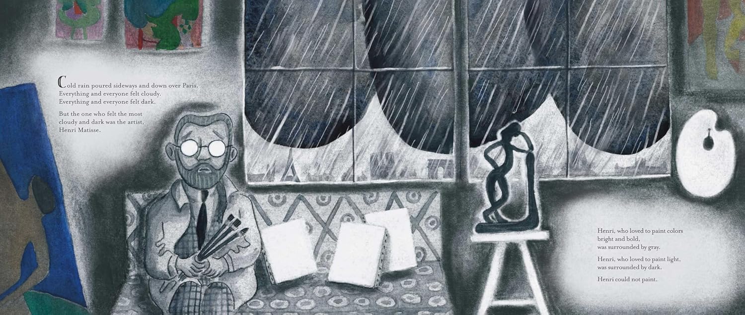 When Henri left the cafe, “he saw an abundance of shadows.” In fact, the dark shadows accentuated the light. Finally, he understood that light and color and dark could work together. In his new paintings he surrounded his colorful subjects with colorful shadows. He interpreted light itself into brilliant color. And in a painting completed from his hotel window, Henri painted shadows of such a dark blue that he realized “he could paint light and color, even in the dark.” At home when Henri displayed his paintings in a gallery in Paris, they were a sensation. Now, whenever the skies turned gloomy and rainy, Henri remembered the abundance of light in Morocco and painted.