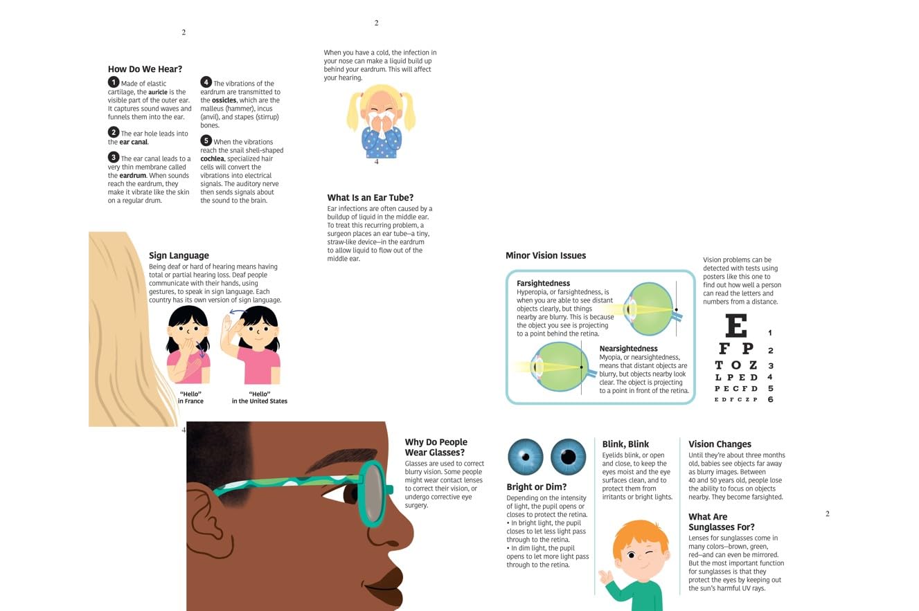 Seeing and Hearing contains information on the parts and working of the eyeball, vision issues, eye color, and more. The hearing section gives kids a look into the inner ear while also learning about sound frequency, earaches, balance, and hearing issues.