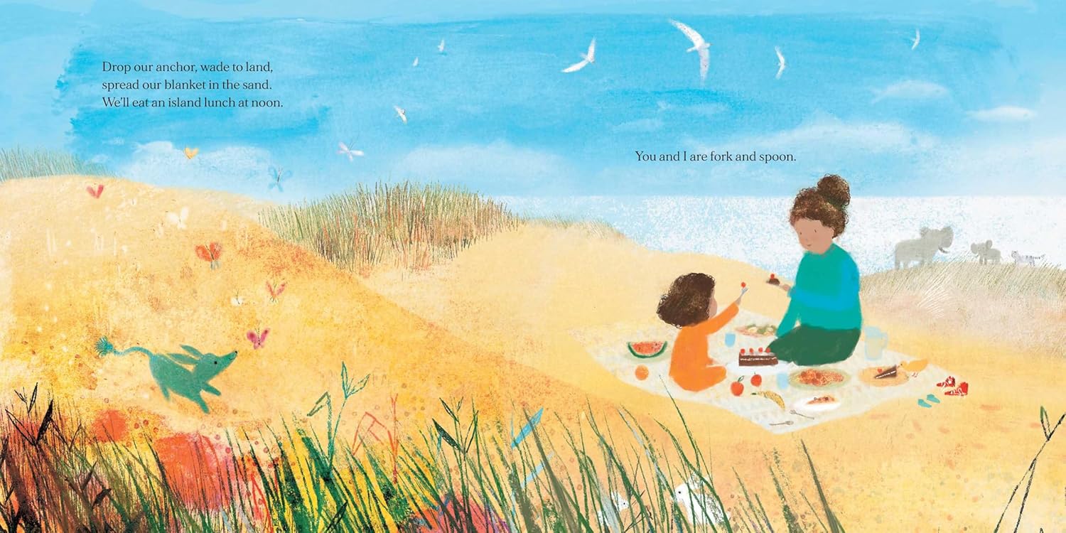 In a seaside village cloaked in slumber, a mother and child hear the call of the wind inviting them to abandon bath time and sail away to a whimsical island. Together, as one, they face and leave behind the day’s waves and “every tentacle and tail” that might hamper a peaceful sleep. The mother assures the child: “You and I are boat and sail.”