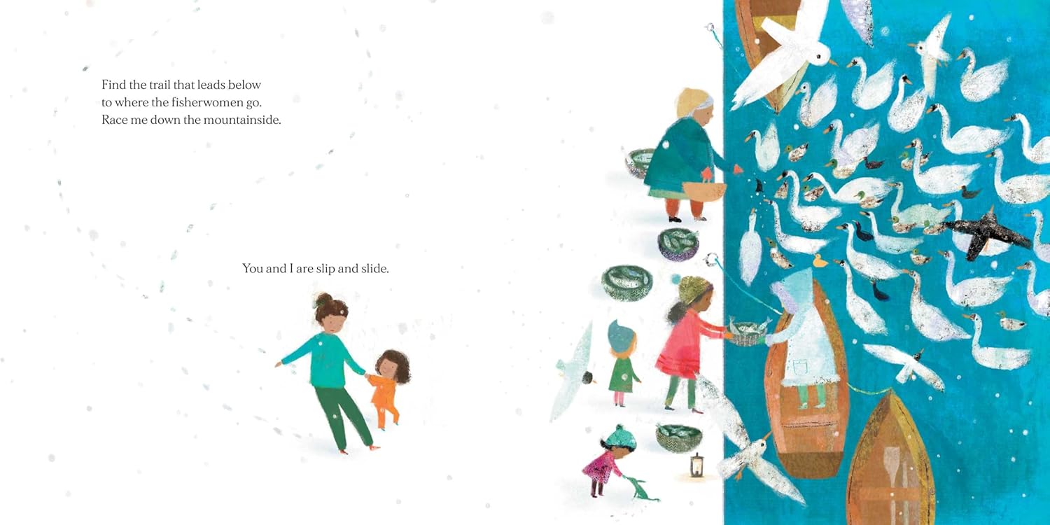They fly over the island seeing a castle and a windmill high on a frozen rock. The mother challenges her child to “find the trail that leads below / to where the fisherwomen go. / Race me down the mountainside. / You and I are slip and slide.” Here, their sailboat is waiting, and as the child steers and the mother navigates, they make their way home again. Snuggled into bed, they read together before sailing into the world of dreams. The mother says, “I’ll wrap you up and hold you tight . . . / You and I are stars and night.”