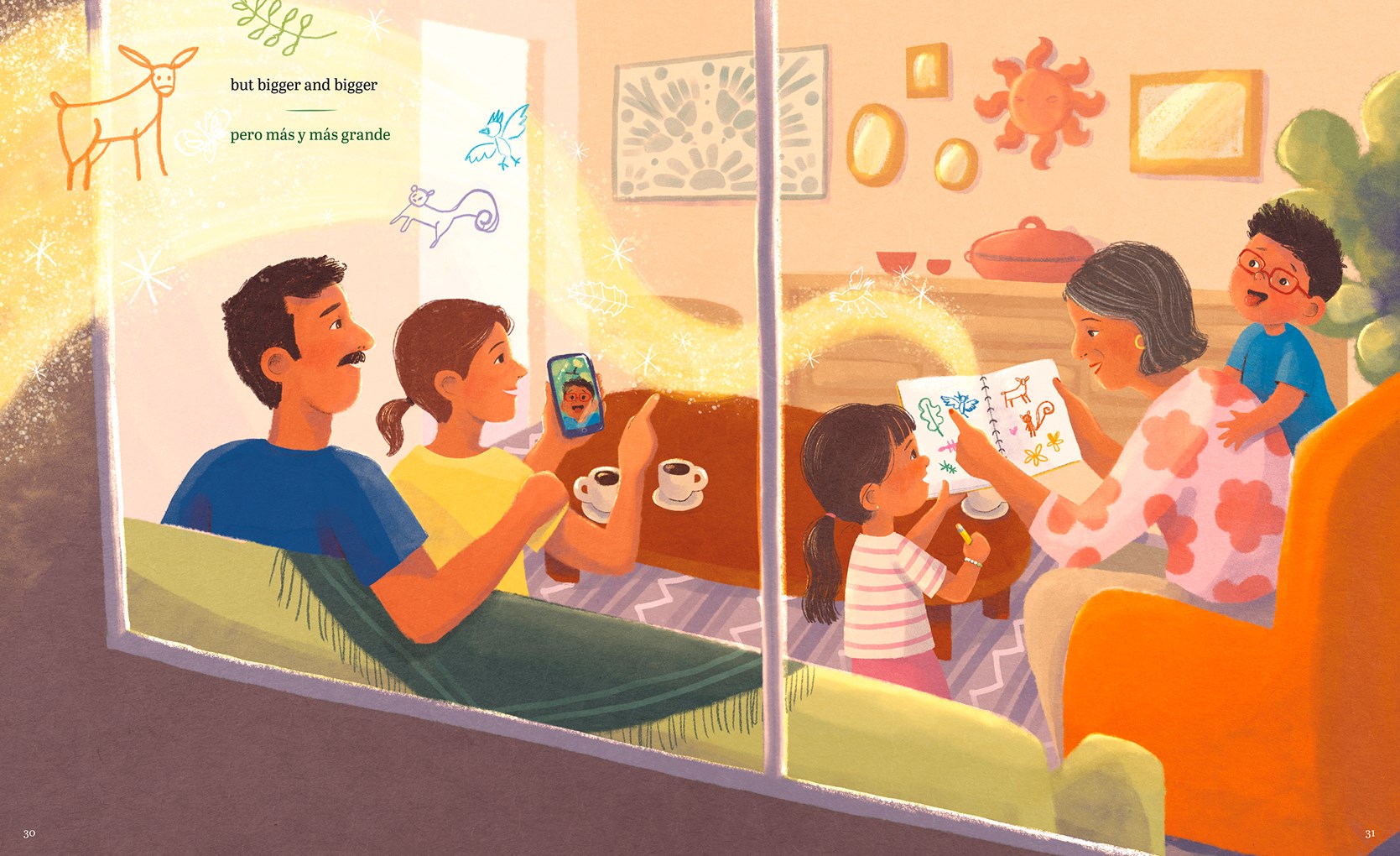 At the park gate, the friendly ranger hands Abue Tita a map. Emilia is captivated by the fresh scent of the pine trees. On the trail, their grandmother encourages them to “‘keep ears, eyes, and hearts open to sorpresas.” Emilia is ready! She loves surprises! And just then, a fluttery sorpresa finds her! Nico, running and leaping, discovers a little salamander on a mossy log. Then they all find more surprises everywhere they look.