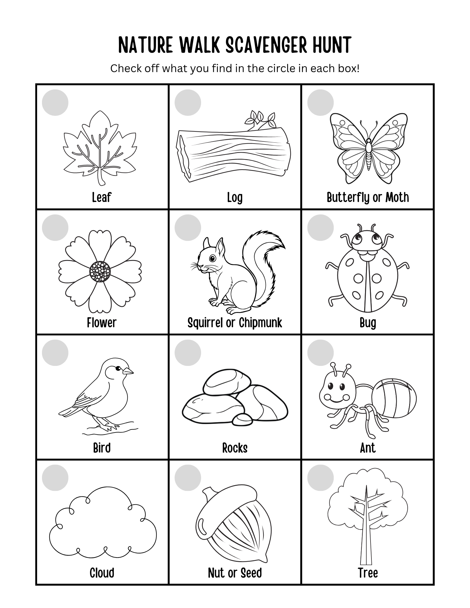 While you’re out walking, look for the wildlife and other things in nature on this Scavenger Hunt or use the page without pictures to create your own list!