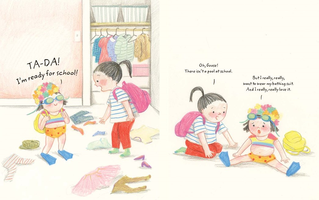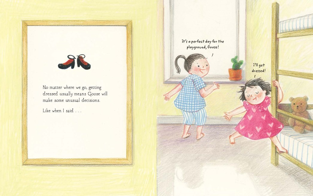 Miranda knows! She gently makes suggestions: something to cover the suit? Goose tries on different looks until one is just right and they run off hand-in-hand to the school bus. A different pair of shoes, perhaps? “But I love them . . .” Goose says, doing a little tap dance, but she admits she can climb and “run fast” in her fancy sneakers. Another great choice! Miranda tells her.