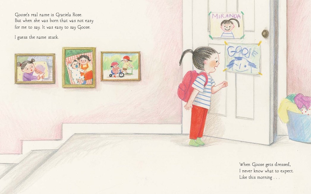 When it comes to dressing, Miranda knows her little sister Goose (real name, Graciela Rose) is a free spirit. But a bathing suit at school? Chunky heels at the playground? A tutu in the snow? Goose’s flashy first choices often leave Miranda astonished. But she loves her little sister, and her little sister really, really loooves her clothes. What’s a big sister to do?