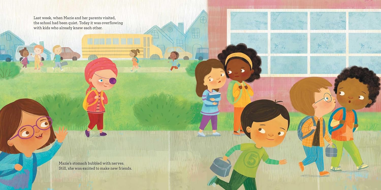 Mazie was starting at a new school, so she “put on her favorite scarf and wore her prettiest eye patch.” As she waved goodbye to her mom and walked into the building with other students, she was happy she’d be able to make new friends. But when she stood in front of her class to introduce herself, the kids’ questioning faces sent her hurrying back to her seat.