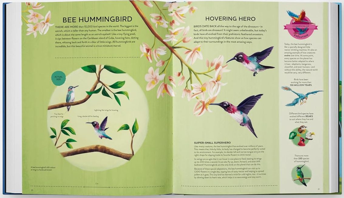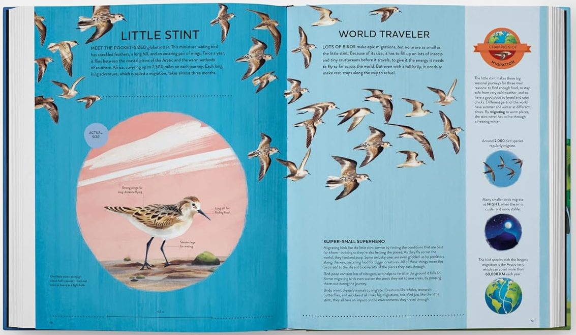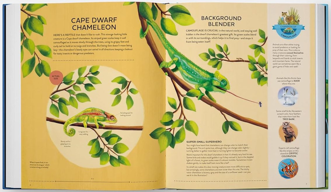 Each two-page spread in this cleverly designed oversized book introduces readers to an animal through Ben Lerwill’s easy-going, conversational description of the primary trait that makes it a champion, an often mind-boggling discussion of its crucial contribution to its ecosystem, and a sidebar containing even more memorable facts about natural phenomena such as camouflage, prey species, migration, metamorphosis, teamwork, survival, keystone species, indicator species, self-defense, and more.