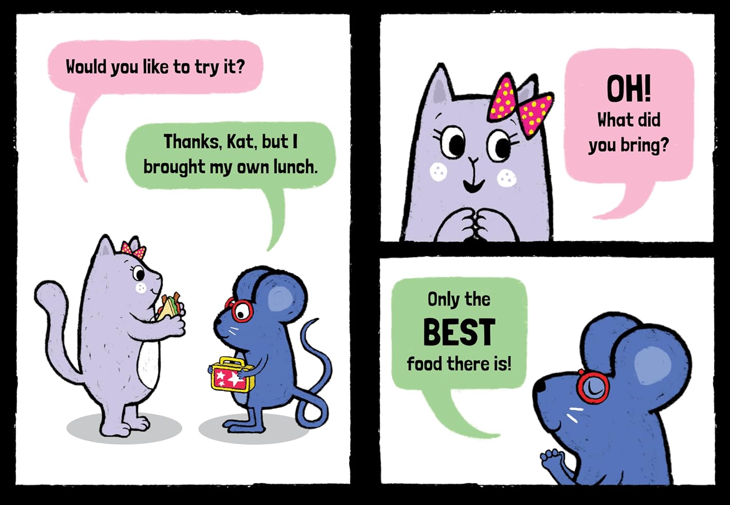 Mouse is happy to resume their usual lunches, but acknowledges that “it’s ok to try new things, too.” Kat perks up. Did Mouse bring a NEW lunch? Indeed he did! In fact, he brought something they will both like. What does he call it? Join them for lunch and find out!