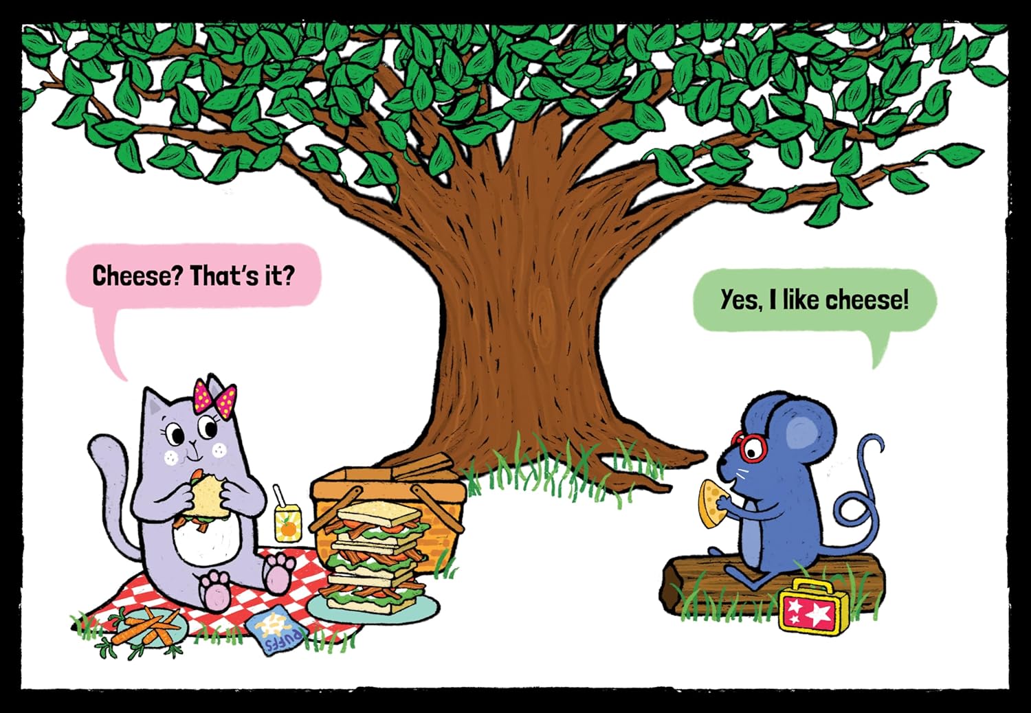Every day Kat and Mouse meet for lunch. Every day Mouse brings “the BEST food there is: “CHEESE!,” while Kat mixes it up with a new kind of “delicious” or “spectacular” or “MEOW-velous” sandwich that she introduces with dramatic flair. Each day, Kat offers to let Mouse try some of her sandwich, but Mouse always declines, assuring her that he likes cheese.