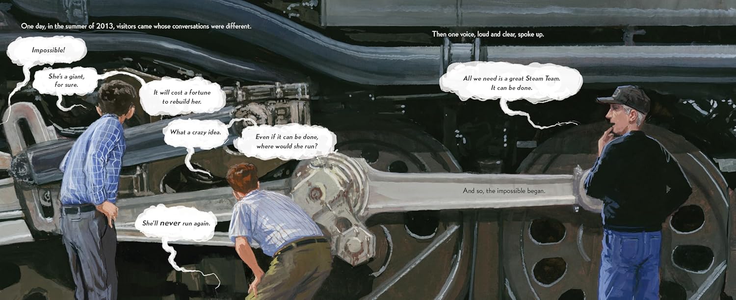 Adam Gustavson’s stunning realistic paintings depict Big Boy 4014 from various perspectives, giving readers a sense of her scale compared to the adults and children, the mountainous landscapes she traversed, and the crowds who came out to celebrate her. Up-close renderings allow train lovers to get a glimpse into the steam-powered mechanics that propelled her while also seeing how run-down she had become over her nearly 60 years of disuse. Each page spread is a showstopper to linger and marvel over as readers gain insight and admiration for these trains and those who created them.