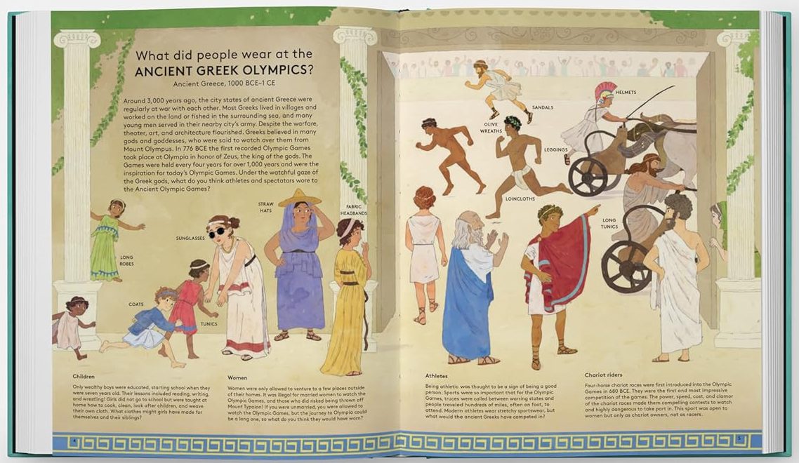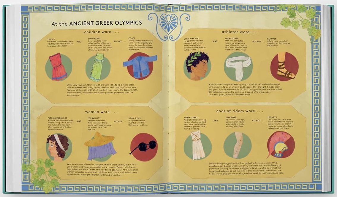 For example, zipping all the way back to 776 BCE Greece, readers find themselves dropped into the first Olympic Games, where they meet a group of children, three women, three athletes, and three chariot riders. Chariot races, kids learn, were “highly dangerous to take part in” due to the “power, speed, cost, and clamor” of the competition. The riders are presented wearing long tunics, leggings, and helmets. Which of these is wrong? Turns out, “despite being dragged behind four galloping horses on a small two-wheeled, open-backed wooden chariot,” riders only wore “a headband to keep their hair down.”