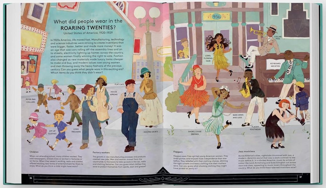 Erin Vanessa’s vibrant and beguiling illustrations transport children to the cities and villages where commoners and the elite mingle clad in the attire of the day. They meet peat cutters and poets, sultans and embroiderers, herders and farriers, and even Queen Elizabeth. They attend a Kabuki theater performance, join revolutionaries as they protest beneath Marie Antoinette’s balcony, and get in the swing as jazz musicians and flappers bring the spirit of the 1920s to a city street.
