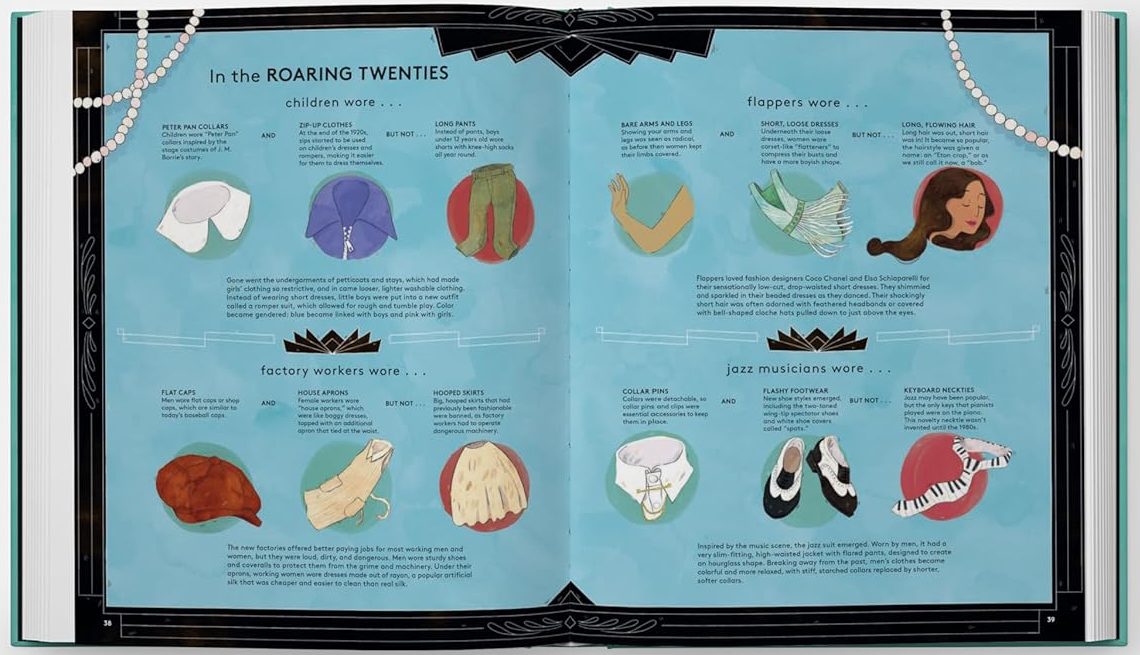 After visiting the past, kids may be hankering to take a peek at their fashion future. They can whisk off to see that too with a section dedicated to addressing contemporary issues such as sustainability to combat the problem of clothing pollution, technological advancements, and how designers adapt to changing needs and styles. A final spread gives readers a quick tour of ten museums with fashion exhibits, and a fun prompt to get kids thinking about what clothing item of theirs they would donate to a museum.