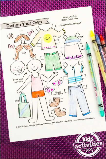 With these free printable Paper Doll Kits by Jen Goode found on Holly Homer’s Kids Activities Blog at kidsactivites.com, fashion lovers can decorate the clothing templates provided. They can then have fun designing their own fashion line with styles, costumes, accessories, and more! Use crayons, markers, or even cut out clothing and accessories from wrapping paper, scrapbooking paper, fabric, and other materials. Get creative!