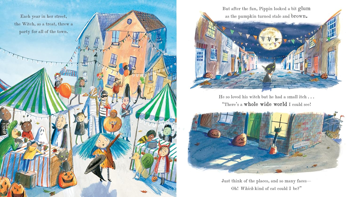 Pippin, a black cat with “brilliant green” eyes, had always been happy being the Witch’s purr-fect companion, but after her latest annual town-wide Halloween street party, he felt a bit of wanderlust: “He so loved his witch but he had a small itch . . . / ‘There’s a whole wide world I could see! / Just think of the places, and so many faces—/ Oh! Which kind of cat could I be?'”