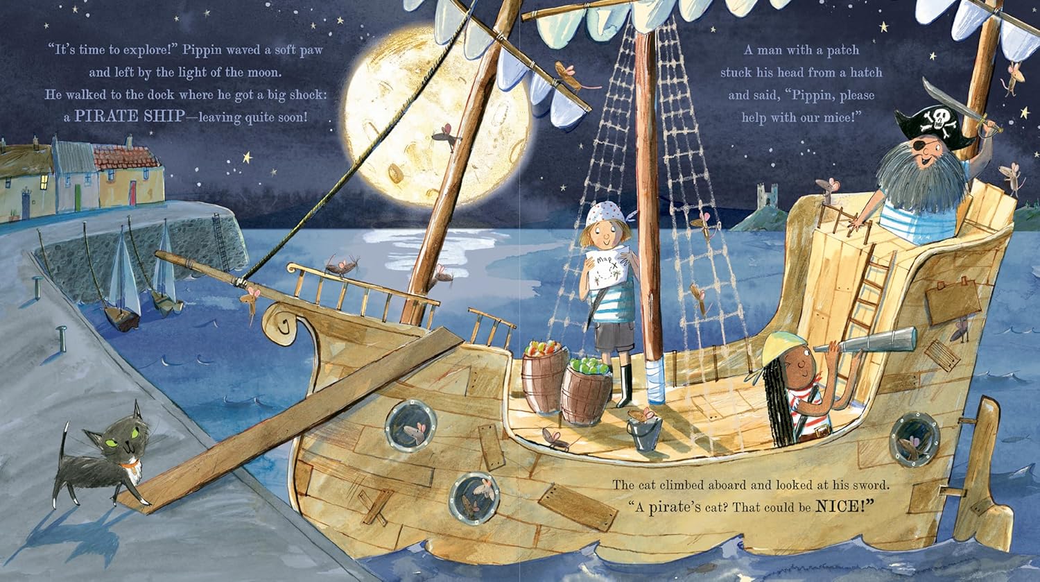 That night Pippin began his journey aboard a pirate ship, invited aboard by the captain who needed help with stowaway mice. But Pippin soon learned he was more of a landlubber than a sailor, so the pirates dropped him off just outside a castle by the sea. A passing knight offered a ride in his wagon, but fighting a fiery dragon was too scary.