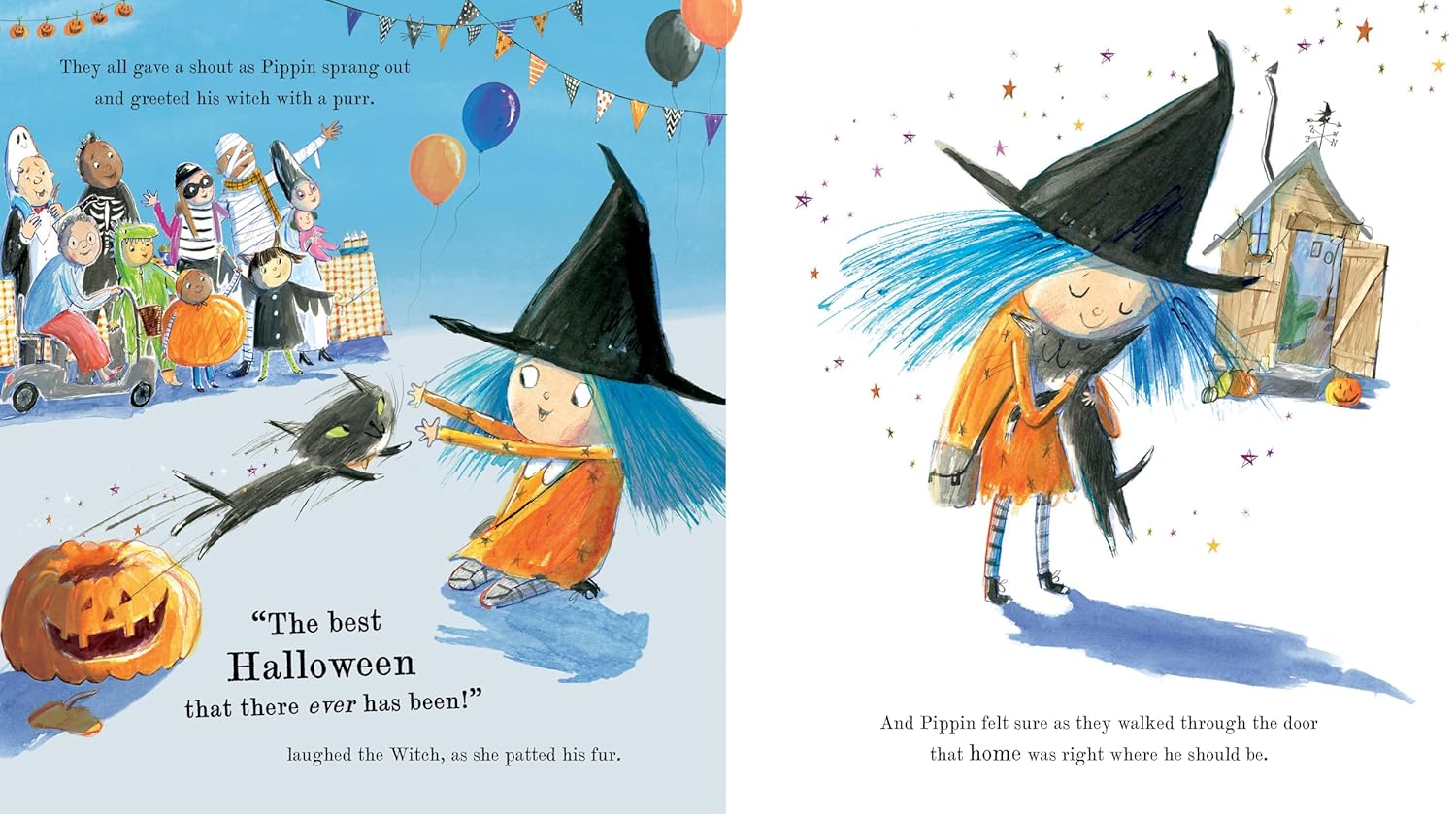 Meanwhile, the Witch was again hosting her party, and while she welcomed her guests with good cheer, it just wasn’t the same without Pippin. The townspeople brought lots of treats, and one even brought a pumpkin “with a huge smiley grin on its bright orange chin and . . . eyes of such brilliant green?!” Just then Pippin jumped out and into his Witch’s arms. She gave him a sweet, tight hug, and Pippin knew he was right where he belonged.