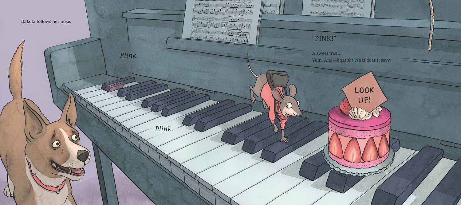 With trepidation Dakota opens the door. “‘Surprise!'” It’s a party for Dakota! And who’s at the door to greet her? Her cousin Julien, holding her present—the “rare and priceless” treasure book she’s been seeking! Dancing and tasty treats await. “And the mice celebrate until Paris twinkles like birthday candles.”