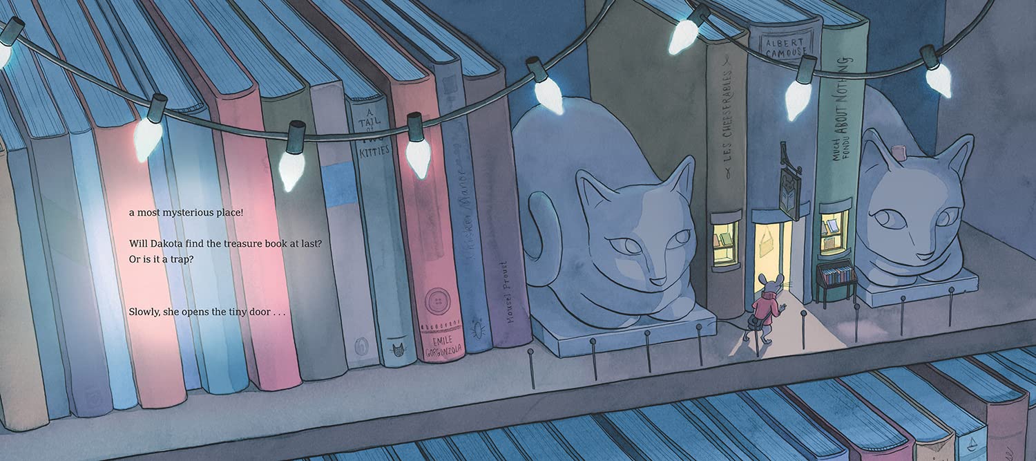 The hunt is still on! Dakota hasn’t found the rare book yet, so she follows the newest clue, which takes her to yet another and then on a wild climb up a long rope. At the top she finds “a most mysterious place!” Lights shine from inside this tiny shop, but it’s flanked by two large stone-cat bookends. Will Dakota find the treasure book at last? Or is it a trap?”