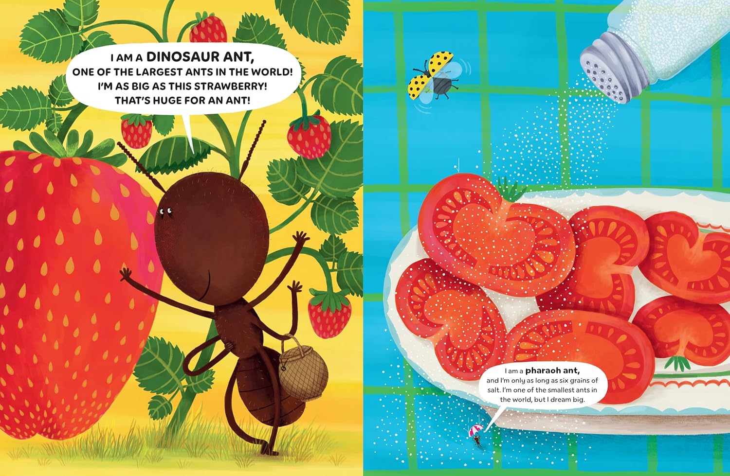A spotted skunk, aka Polecat, sits front and center, backlit by a sunset glow, promising to reveal his “DOOZY of a superpower”—but only after divulging all the other relevant information about himself. Things like why he chooses to live in a very particular place while being not that particular about where he lives; when polecats hunt for food, and how they’re “always, always alert for hungry predators.” It’s at this moment when the word “predators” hangs ominously in the air that Porcupine “SPROINGS” into view, frightened by the prospect of being eaten, and mistakes Polecat for a baby skunk.