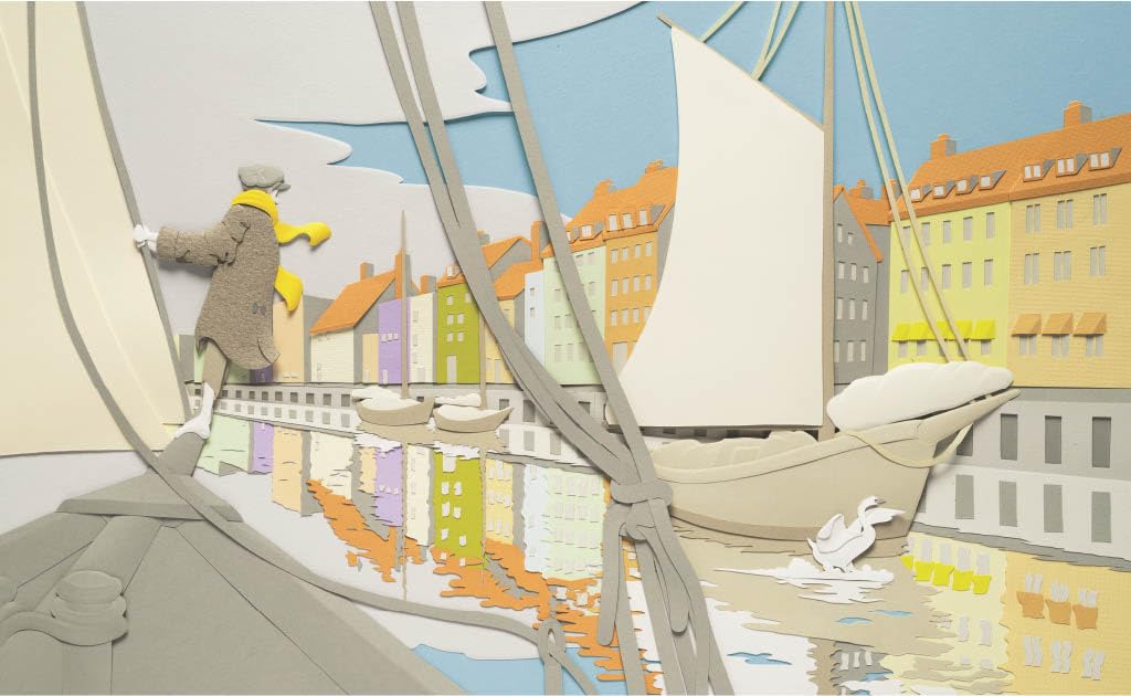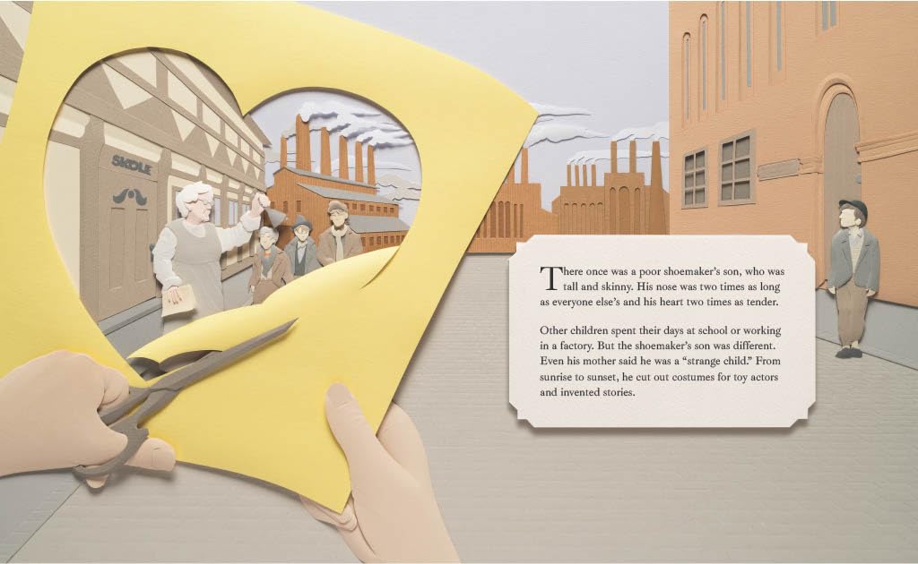 Visually arresting, Calvin Nicholls’ extraordinary paper sculpture illustrations pop with action and emotion, immersing readers in the sights and sounds of Andersen’s factory hometown, his experiences in Copenhagen, and the joy of his long-dreamed-for success. The realism of Nicholls’ low-relief sculptures, assembled from various weight and textured papers then photographed, are astounding. Nicholls’ color scheme mirrors the theme of the “Ugly Duckling,” portraying Andersen in muted grays and browns until his full transformation when he dazzles Copenhagen royalty in a white tuxedo.