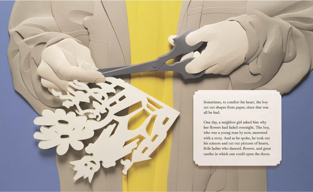 Then one day when a girl asked him why her flowers had faded, Hans—now a young man—answered her by telling a story while cutting a scene in paper of hearts, dancers, flowers, and castles with working doors. The girl loved the story so much that Hans wrote it down and had it printed into a book. “The children of Copenhagen adored every word.”
