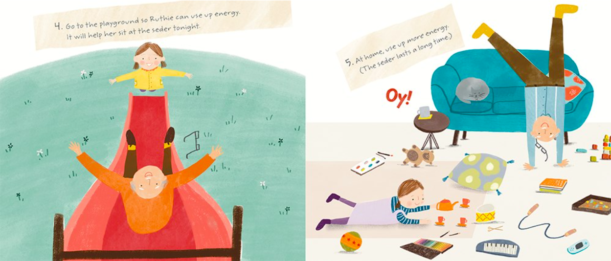 She receives a treasure chest full of gold and gems, a merry-go-round from her best friend, and a time machine from her cousin that transports them “back two thousand years” to meet the Maccabees. On the sixth night, her Zaidie gives her rocket boots, and on the seventh night, her younger brother presents her with her very own unicorn. Actually it was three energetic unicorns, including a baby that liked to eat socks.