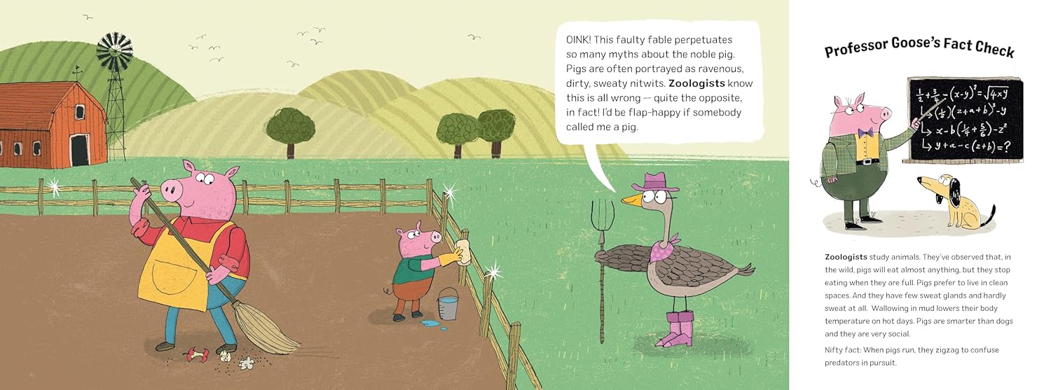 But wait! Before you move on in the story, Professor Goose reveals that even these brief profiles are full of erroneous myths! To clear things up, the professor imparts zoologist-approved information, including such facts as pigs don’t gorge themselves, they lay in mud to lower “their body temperature on hot days,” and, because pigs have few sweat glands, they always stay fresh and dry.